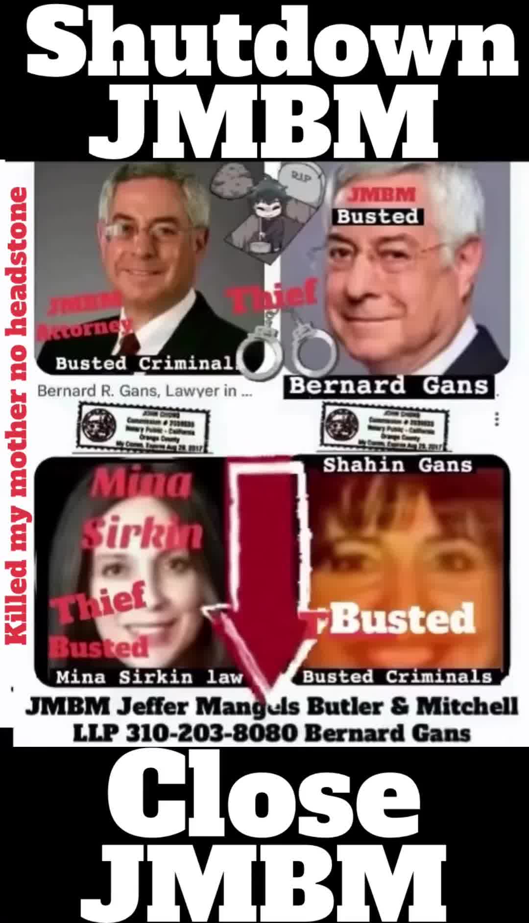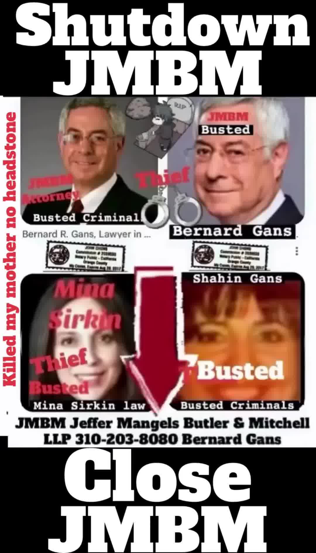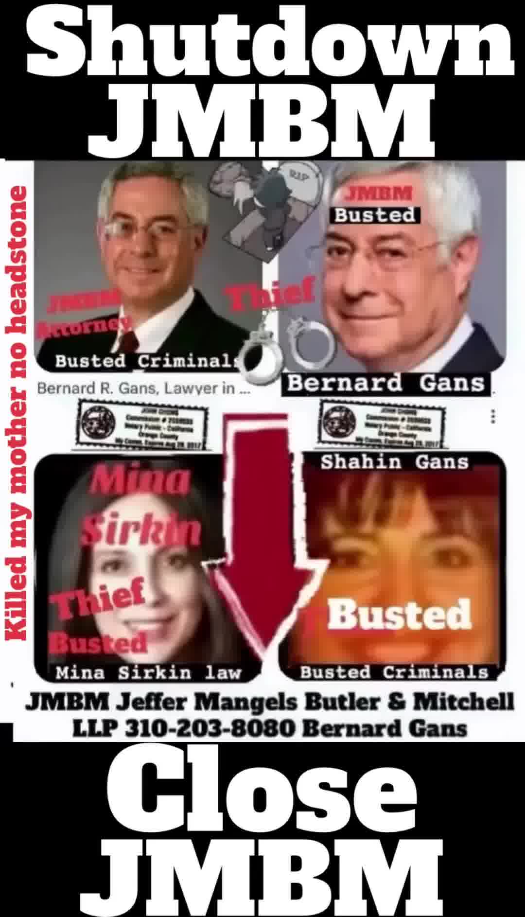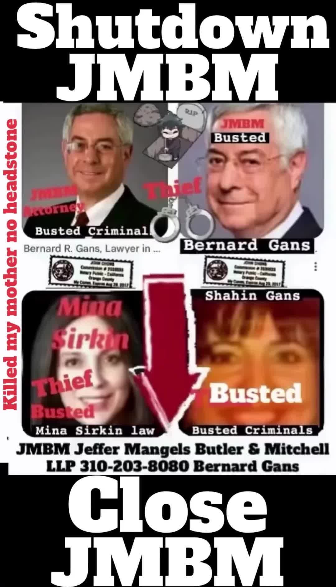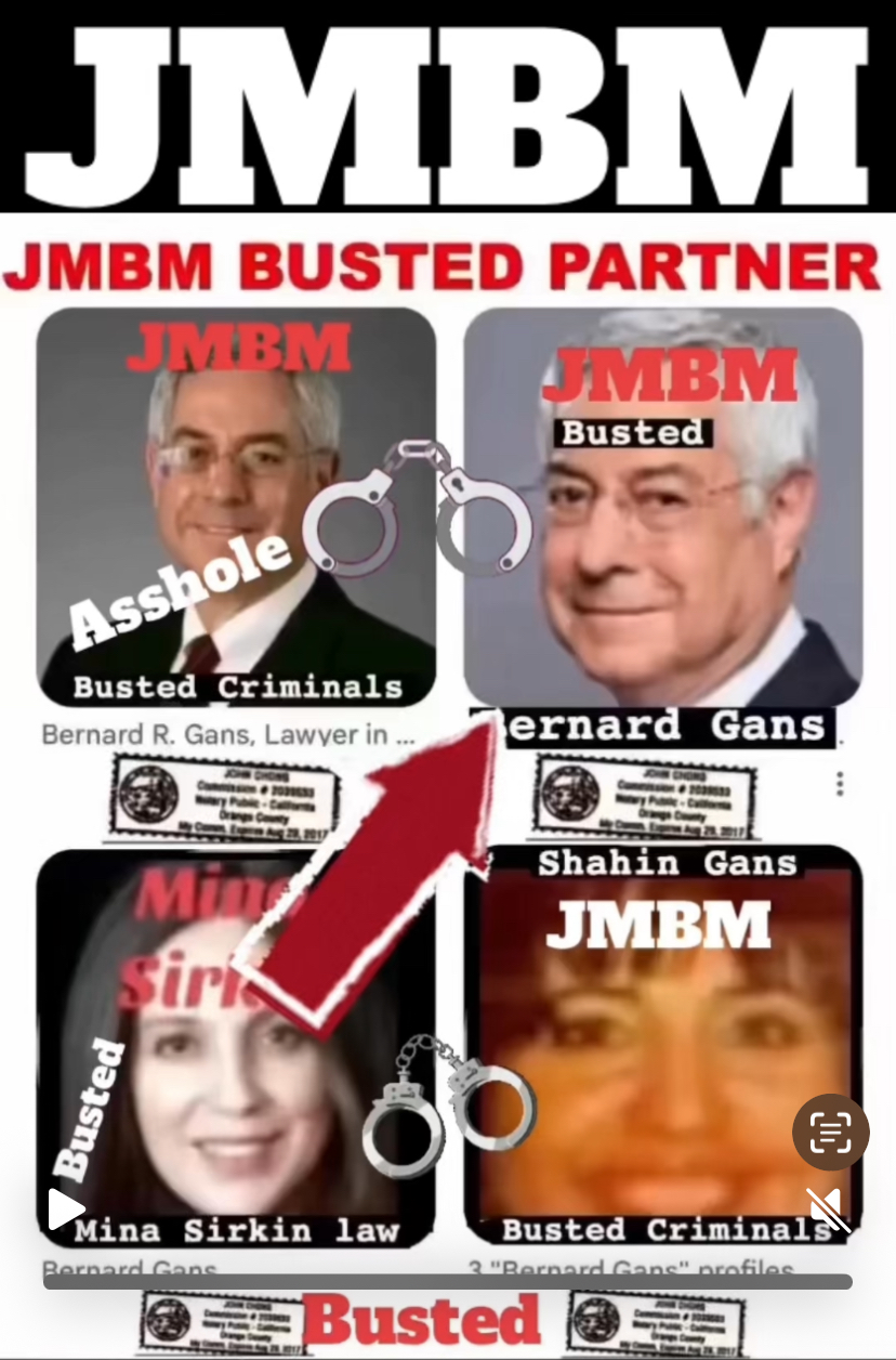 Suing JMBM partner $500,000,000,000.00 Busted criminal attorneys Jeffer Mangels Butler & Mitchell LLP lawyer Bernard Reginald Gans #57068 Bernard Gans Mina Sirkin law group JMBM killed my mom to get her fortune. Suing JMBM partner $500,000,000,000.00 Busted criminal attorneys Jeffer Mangels Butler & Mitchell LLP lawyer Bernard Reginald Gans #57068 Bernard Gans Mina Sirkin law group JMBM killed my mom to get her fortune.
